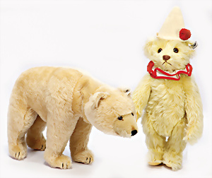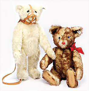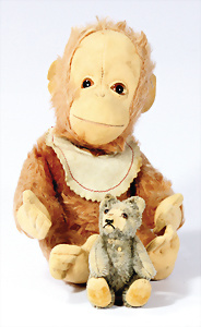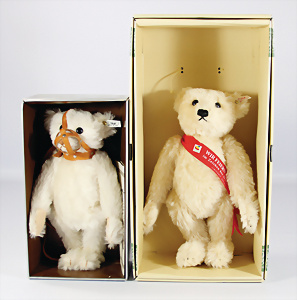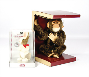 2 Tiere, 1x Schimpanse, Replika von 1928, mit Knopf, Schild u. Fahne, von 1993, 26 cm, unbespielt im Kart., Klarsichthülle fehlt, 1x Holländer-Hase, Replika von 1911, unbespielt im Orig.-Kart.