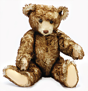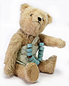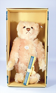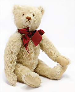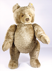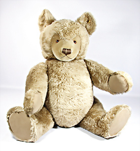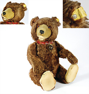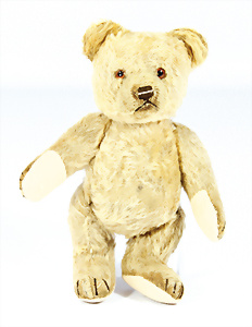 Jackie, Jubiläums-Bär, 1953, 25 cm, ohne Knopf u. Schild, abgeliebt, Tatzen übernäht, Stoff an 1 Arm hinten etwas eingerissen, Druckstimme defekt