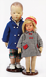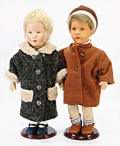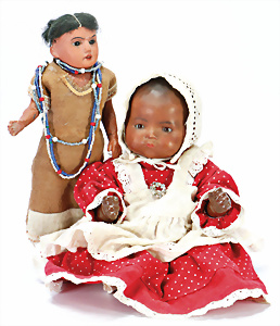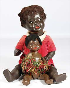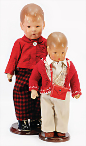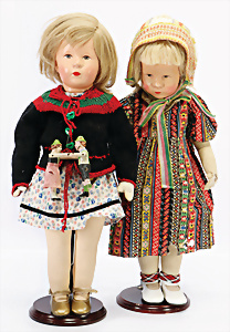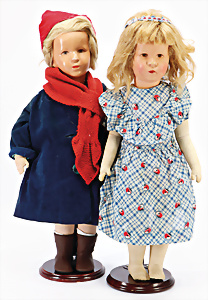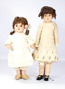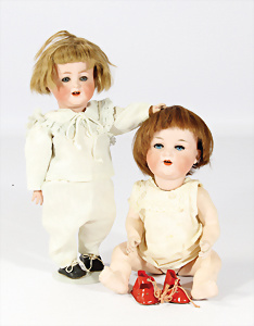 2 Masse-Puppen, 1x gem. 342.7½, braune Schelmenaugen, off. Mund, 2 Zähne oben, Zunge, Echthaar-Perücke, Masse-Stehbaby-Körper, 60, 1x gem. 342.6, braune Schlafaugen, off. Mund, 2 Zähne oben, Zunge, Echthaar-Perücke, Masse-Stehbaby-Körper, bespielt, 1 Finger weggebrochen, 55 cm