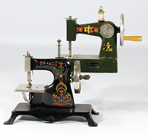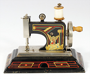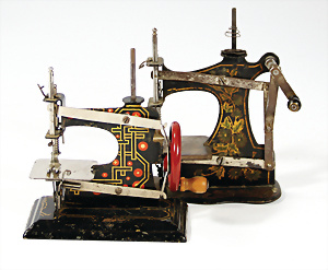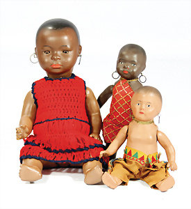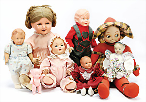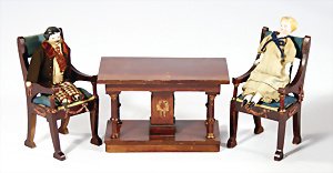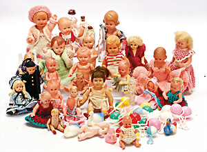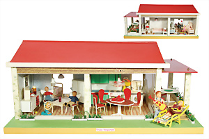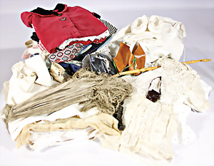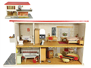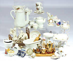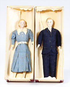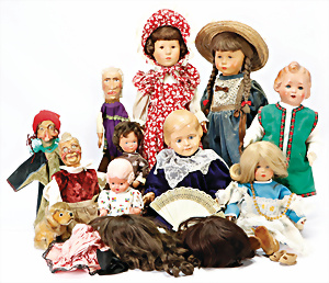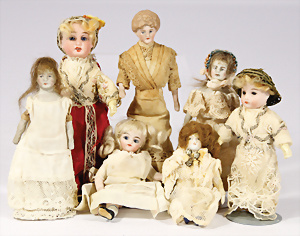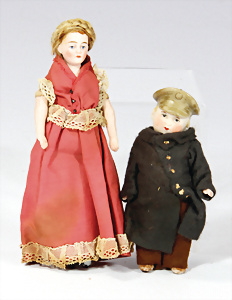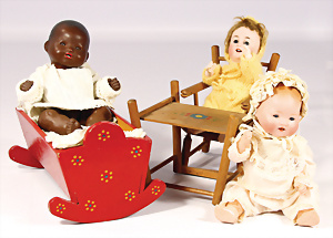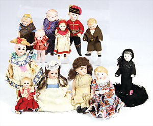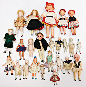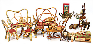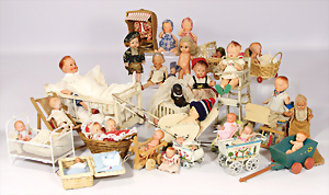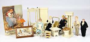 Konv. Puppenstuben-Ausschmückungsteile, Toilette, Sitzgruppe, Kinderwagen, Schaukel, H: 20 cm, Lampe mit Tisch, 50er Jahre, 4 Puppenstuben-Puppen, Biskuit-Brustblattköpfe, Arme u. Beine, Stoffkörper, Mann 1 Arm fehlt, 1 MINERVA, Celluloid-Puppenstuben-Puppe, Mann, 14 cm, alte Kleidung, 1 Heft GÜNTHERMANN´s Puppenschnittmuster