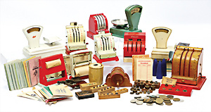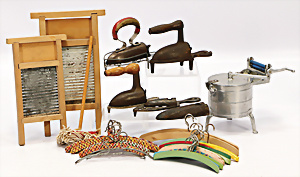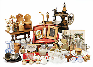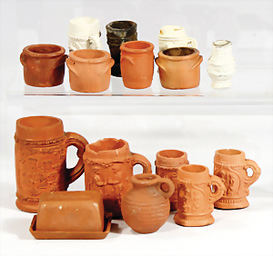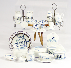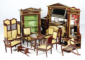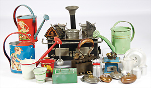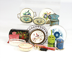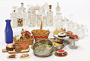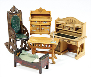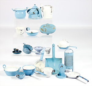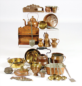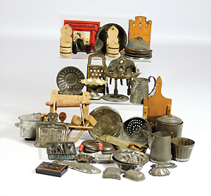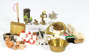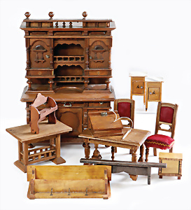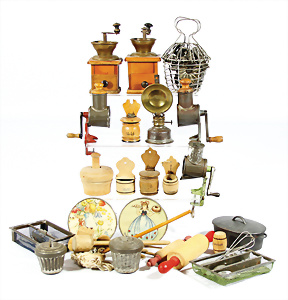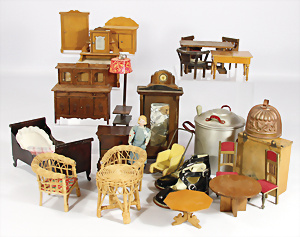 Konv. Puppenstuben-Ausschmückungsteile, 1890-1940, darunter 1Ausziehtisch um 1900, Spiegelschrank, Jugendstil-Schrank, H: 14,5 cm, 1 Wasserbehälter, 1 Einkochtopf, Aluminium, 1 Blech-Bett ROCK & GRANER, farbl. überarbeitet