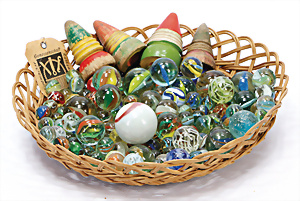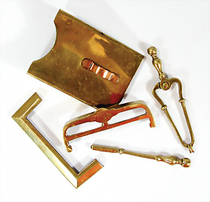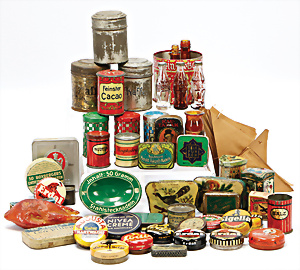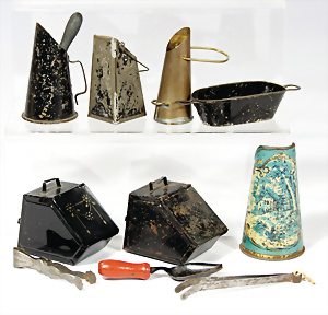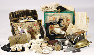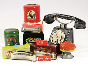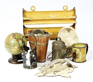Fundkiste, Puppenküchen-Teile, 30er-50er Jahre, 1 Brenner, einige Teile Glas, einige Schablonen Kupfer, bitte besichtigen