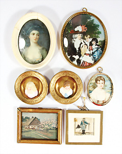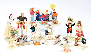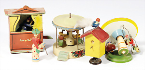 Konv, Miniaturen, Karussell, 6 cm, 1 Fahrzeug fehlt, 1 Kettenkarussell, nicht komplett, kl. Puppenstuben-Kasperl-Theater, 8,5 cm, 1 Hebamme, jünger