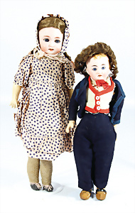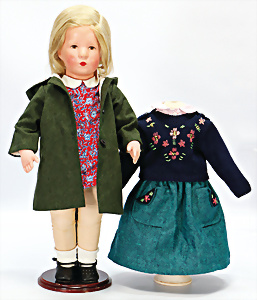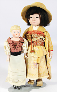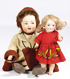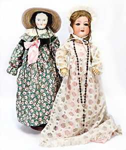 2 Porzellankopf-Puppen, 1x SCHOENAU & HOFFMEISTER, gem. 5600, blaue Schlafaugen off. Mund, Zähne, Echthaar-Perücke, auf Masse-Gliederkörper, 40 cm, 1x Brustblattkopf-Puppe, gem. Germany 275.7, blaue fest eingesetzte Glasaugen, off. Mund, Zähne, Echthaar-Perücke, Wachstuchkörper, Masse-Unterarme, 42 cm, Kleidung aus alten Stoffen nachgenäht
