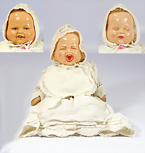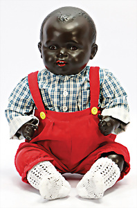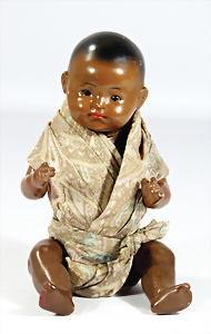 Farbiges Einbindekopf-Masse-Baby, 45 cm, braune Schelmenaugen, off. Mund, oben Zähne, Transportrisiko für Augenmechanismus beachten, Masse-Sitzbaby-Körper, Stoff-Rumpf, Stimme etwas schwach, guter Zust.