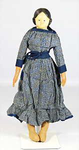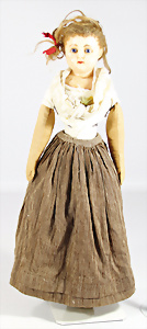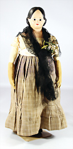 Papiermaché-Brustblattkopf-Puppe, Biedermeier, 68 cm, braune fest eingesetzte Paperweight-Augen, geschl. Mund, ausmodell. Haar, am Brustblatt farbl. etwas ausgebessert, einfach genähter Stoffkörper, Leder-Arme, alte Kleidung u. Schuhe