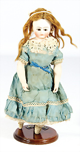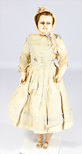 Porzellankopf-Puppe, gem. 390, blaue Schlafaugen off. Mund, Zähne, Echthaar-Perücke fest aufgeklebt, von außen keine Risse erkennbar, bitte Transportrisiko für den Augenmechanismus beachten, auf Masse-Gliederkörper, mit Kugelgelenken, Farbe an den Händen etwas abgewaschen, 53 cm, Kleidung aus alten Stoffen nachgenäht
