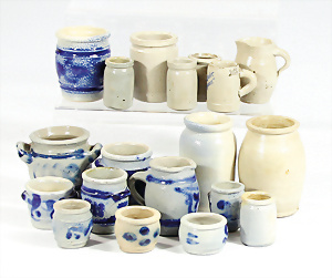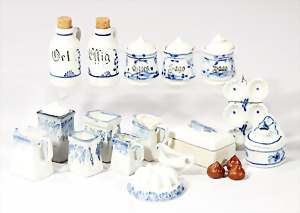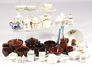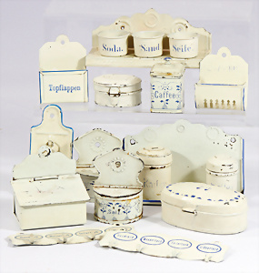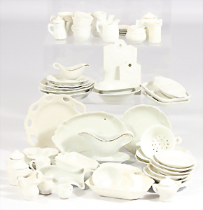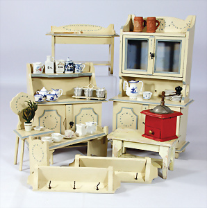 Konv. Puppenküchen-Möbelprogramm, ca. 1910, Schrankhöhe 37 cm, Kommode, Waschtisch, Regale, Tisch, Stühle, Zubehör, Keramik, Porzellan, 1 paar Teile jünger, Dachbodenfund, Orig.-Zust.