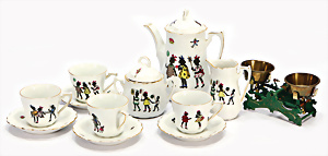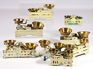Konv. Waage, Jugendstil, Guss, grün / gold, 12 cm, mit Gewichten, dazu 1 Puppenstuben-Service, Porzellan, farbige Kinder, H: Kaffeekanne 15 cm