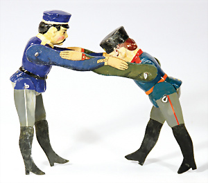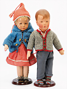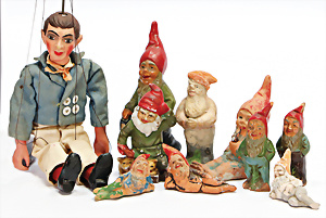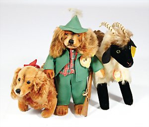 1x Waldili, Jäger, kompl., Nr. 326, mit Gehwehr, Lederband gerissen, 1x Snucki, kompl., Nr. 132200, 1 Dackel. Knopf u. Fahne, Nr. 4140-17, guter Zust.