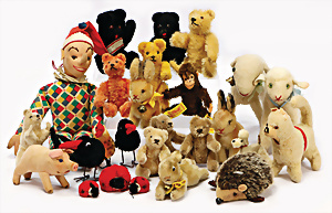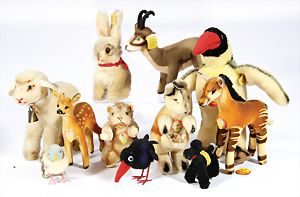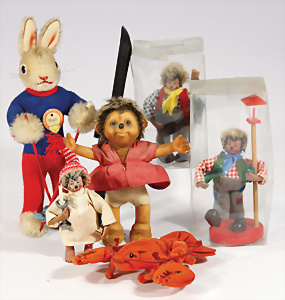 Konv. Hummer, ohne Knopf u. Schild, 10 cm, 1 Ski-Hase, Hupfi, mit Schild, ohne Knopf, 3 Mecki-Figuren, Österreich