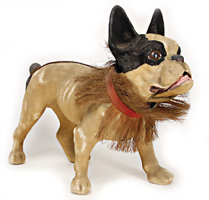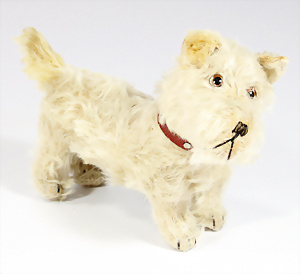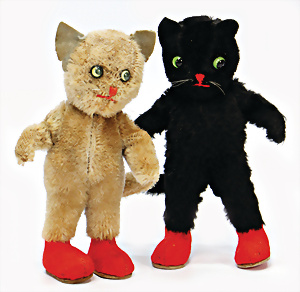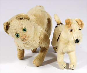 Katze, Vorkrieg, mit Knopf, langgezogenes f, 5-fach gegliedert, 27 cm, etwas abgeliebt, kl. Flickstelle am Hinterkopf, seitl. etwas fleckig, dazu 1 Schnauzer mit US-Fahne, bespielt
