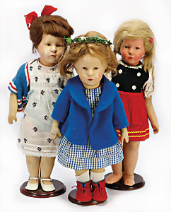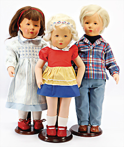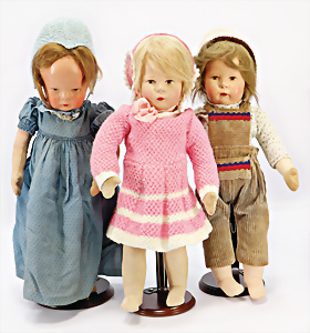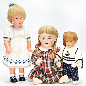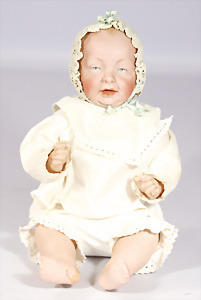 GOEBEL Biskuit-Porzellan-Charakter-Baby, gem. B5-4, 40 cm, blaue Schlafaugen, off. Mund, Zähne u. Zunge, Kinngrübchen, Sitzbaby-Körper mit abstehendem Zeh, Echthaar-Perücke, bespielt, dazu 1 Mädchen, SCHILDKRÖT, Typ KÄTHE KRUSE, Gr. 10, Tortulon, Kurbelkopf, gemalte Augen, 1 KÄTHE KRUSE Däumelinchen, neuere Produktion