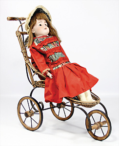 Biskuit-Porzellan-Brustblattkopf-Puppe, Belton-Typ, 32 cm, braune fest eingesetzte Paperweight-Augen, geschl. Mund, durchst, Ohren, Stoffkörper, Biskuit-Arme, Orig.-Mohair-Perücke, Orig.-Kleidung, altersbed. etwas verschlissen