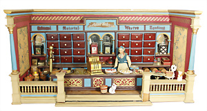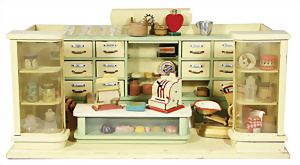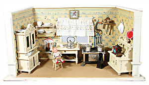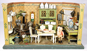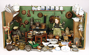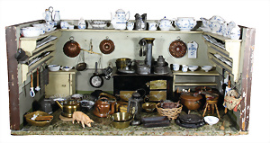 Puppenstuben-Küche, ca. 1890, B: 78 cm, H: 35,5 cm, fest eingebaute Regale, fest eingebauter Schrank, reichh. Zubehör, mit Herd, teils kl. Fehlstellen am Zubehör