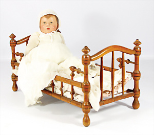 Mädchen, Puppe Nr. VIII, 50 cm, Stoffkopf, deutl. sichtbare Hinterkopfnaht, deutl. Farbunterschied zwischen Halskrause, Armen u. Körper, mögl. Weise, Arme 1x ausgetauscht, Kopfbemalung wohl orig., nichts unter UV-Licht sichtbar, bitte besichtigen, mit Kleidung