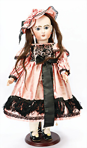 Porzellan-Kopf-Puppe, gem. Ed Tasson Deposé Fabrication francaise Favorite 14, blaue fest eingesetzte Paperweight-Augen, off. Mund mit modell. Zahnreihe oben, durchst. Ohren, Echthaar-Perücke auf franz. Gliederkörper, 72 cm, alte Kleidung oder aus alten Stoffen nachgenäht, Farbabrieb an den Händen, rechte Hand ergänzt