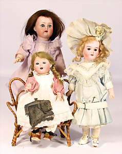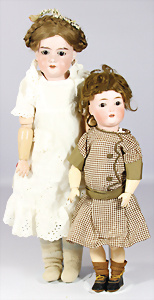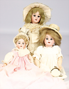 2 Porzellankopf-Puppen, 1x WALKÜRE Germany 3½ 58, blaue Schlafaugen off. Mund, Zähne, Echthaar-Perücke, fest aufgeklebt, von außen keine Risse erkennbar, bitte Transportrisiko für den Augenmechanismus beachten, auf Masse-Gliederkörper, 54 cm, 1x gem. ARMAND MARSEILLE Germany 390 A.9.M., blaue Schlafaugen off. Mund, Zähne, 2 Zähne bestoßen, Echthaar-Perücke neuer, auf franz. Gliederkörper, 1 Finger weggebrochen, 65 cm