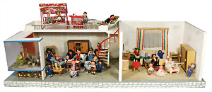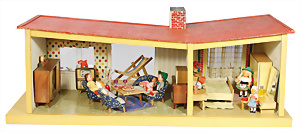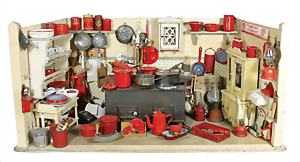 Puppenstuben-Küche, ca. 1910, B: 81 cm, H: 38 cm, T: 40 cm, möbliert, alte Bemalung, alte Tapete, reichh. Zubehör, viele, seltene rot emaillierte Teile