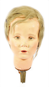 Schaufenster-Puppe, Kopf Mädchen, für ca. 90 cm – 1m, Riss auf der Stirn, kl. Lackfehler, Orig.-Perücke mit seitl. Druckknöpfen