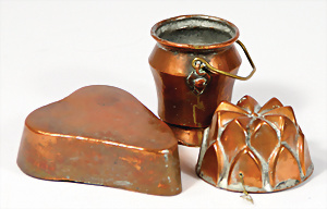 3 Teile, Puppenküchen-Zubehör, Kupfer, gehämmert, Kanne ohne Deckel, 5 cm, 2 Backformen