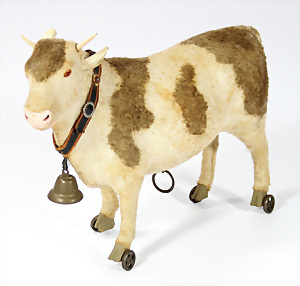 Ochse, Papiermaché, 27 cm, auf Blech-Rädern, Zugstimme intakt, guter Zust., um 1900