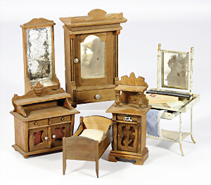 Puppenstuben-Möbel, Gründerzeit, Schrank, H: 16,5 cm, Kommode, Spiegel, Nachttisch, 1 Bett, älter, 1 Spültisch mit Kippspiegel u. Schublade, Blech