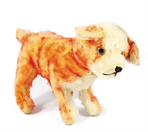 Hund, Vorkrieg, Drehkopf, Druckstimme defekt, rot/weiß, Mohair teilw. abgeliebt, Stehhöhe 16,5 cm