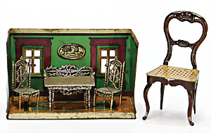 Blech, H: 8 cm, ohne Einrichtung, dazu filigrane Silberarbeit, Sitzgruppe, 1 ROCK & GRANER BIBERACHER BLECH, Stuhl, H: 10 cm, kl. Lackfehler, Orig.-Zust.