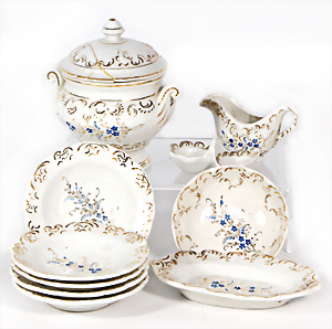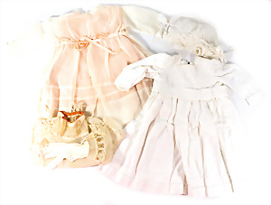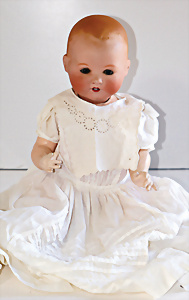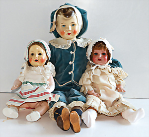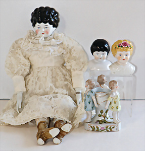 3 Porzellan-Puppen, Porzellan-Brustblattkopf-Puppe, gem. AM 3200, Haarriss am Hinterkopf, braune Schlafaugen, off. Mund, Zähne, Echthaar-Perücke, einfacher Stoffkörper, Masse-Unterarme, 65 cm, Kleidung alt oder aus alten Stoffen nachgenäht, 1x Porzellan-Puppe, gem. Germany2, blaue Schlafaugen, Wimpern, off. Mund. Zähne, Echthaar-Perücke, fest aufgeklebt, bitte Transportrisiko für den Augenmechanismus beachten, von außen keine Risse erkennbar, auf Masse-Gliederkörper, stärker bespielt, stellenw. ausgebessert u. überstrichen, 58 cm, alte Kleidung u. Unterkleidung, 1x Brustblattkopf-Kuppe, modell. Frisur, gemalte Augen, geschl. Mund, Stoffkörper, Porzellan-Arme u. -Unterschenkel mit modell. Stiefeln, 25 cm