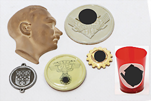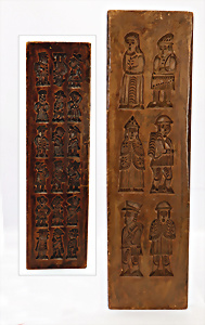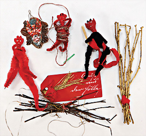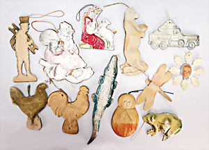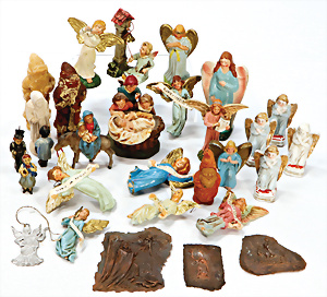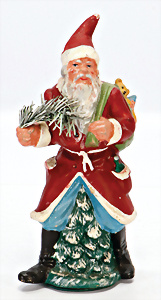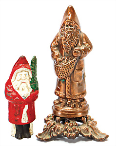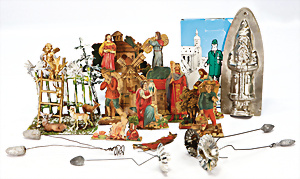 Konv. Weihnachtsschmuck, Schokoladenform, Weihnachtsmann, 17,5 cm, 3 Kerzen-Halter mit Zapfen-Gewicht, 1 Weihnachtsszene Zinn-Guss, Baum lose, einige Papp-Aufsteller Figuren u. Gebäude für Krippenszene