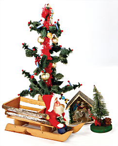 Weihnachtsmann mit Schlitten, Papiermaché, Kunststoff-Händen u. -Füßen, dazu kl. Papp-Krippe mit Oblatenbildern, 23 cm, 2 Weihnachtsbäume, 13 u. 33 cm