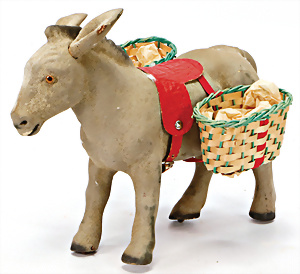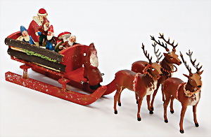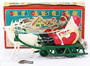 Santa Claus mit Rentier, Japan, Celluloid u. Blechteile, Uhrwerk u. Klingel intakt, 21 cm, neuw. Im Orig,-Kart.