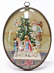 Kl. Aufstell-Oblatenbild, geschmückter Weihnachtsbaum mit Kindermotiv u. Weihnachtsmann, gerahmt, Innenmaß 9,5 cm