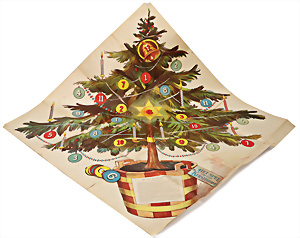 Weihnachtsspiel, ca. 1902, Het spel om den Klerstboom, Papier, bunt lithogr., zum auffalten, 80x75 cm, Holland mit Anleitung u. 18 Spieltafeln, minim. Fehlstellen am Rand, sonst gut, ausgefallen