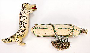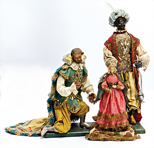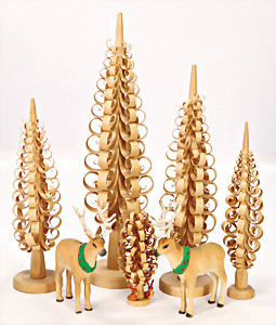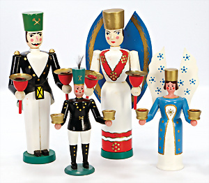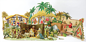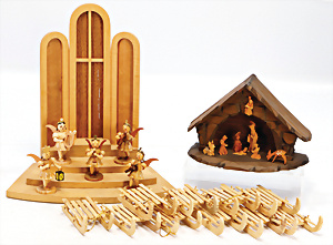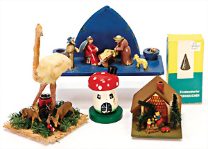 Konv. Krippen-Szene, Holz mit 2 Leuchtern, 2 Räucherhäuschen, Leuchter mit 2 Masse-Tieren, 1 Wattestrauß, Räucherkerzen