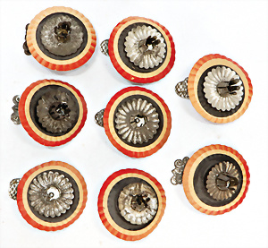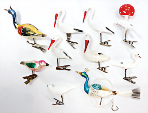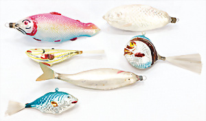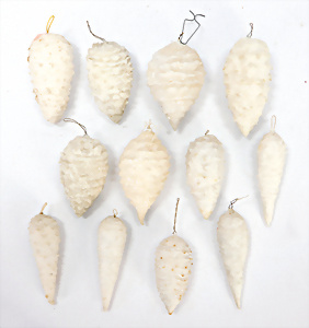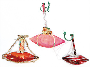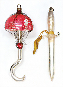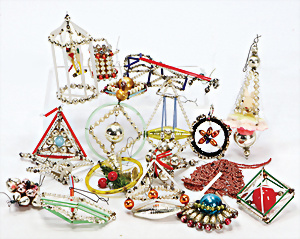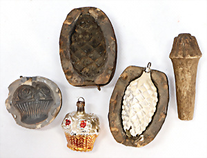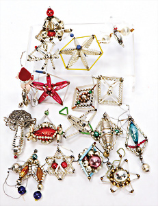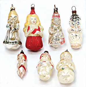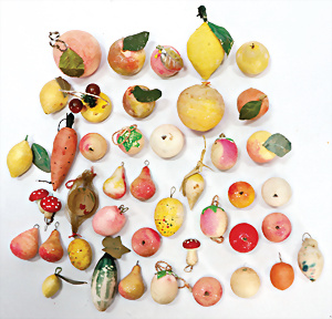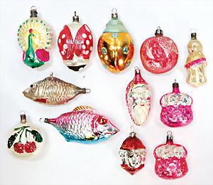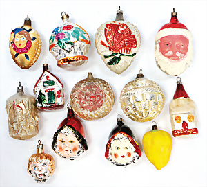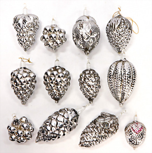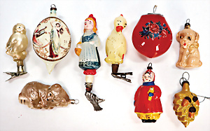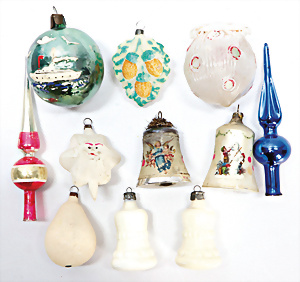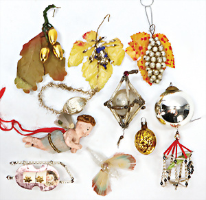 11 Teile Weihnachtsschmuck, Milch- u. Spiegelglas, 2 kl. Zapfen, Kugel mit Schiff, Glocken, Stern, Früchte