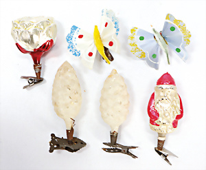 Konv. Weihnachtsschmuck, 2 Schmetterlinge mit Klammer, Glasfaserflügel, Blüte mit Klammer, Weihnachtsmann, 2 Zapfen