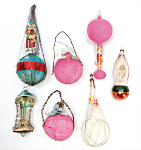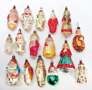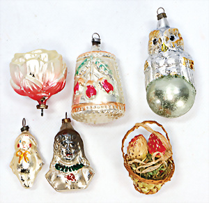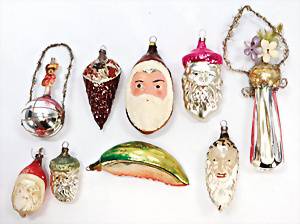 9 Teile Christbaumschmuck, Glas, Tüte mit Spielzeug, 11 cm, ausgefallen, Weihnachtsmann-Köpfe, Ballon mit Oblaten-Bild, Zapfen mit Blüten, Melonenstück