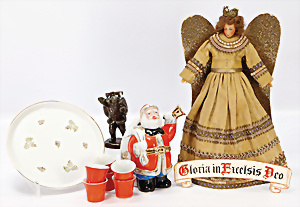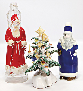 Weihnachtsmann, Porzellan, 22 cm, 1 Weihnachtsmann, Glas, Flasche, 30,5 cm, teilw. Lackabrieb, 1 Weihnachtsbaum, Porzellan