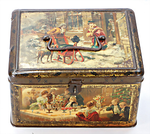 Blechdose mit Winterszene, Schlitten, Hund u. Personen, seitl. Weihnachtsszene, Bescherung, H: 15 cm, altersbed. Lackfehler