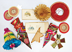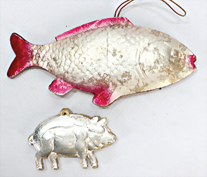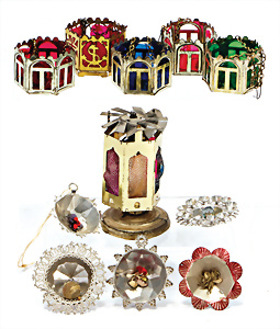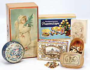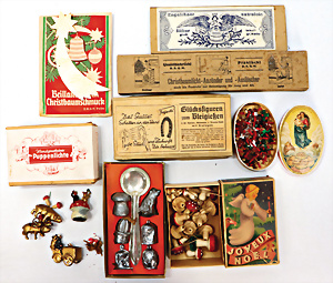 Konv. Schachteln, Engelshaar, Christbaumlicht-Anzünder, Brilliantfolien, Christbaumschmuck, Puppenlichter (Kerzen), 1 Schachtel Glücksfiguren zum Bleigießen