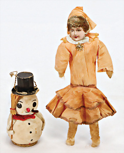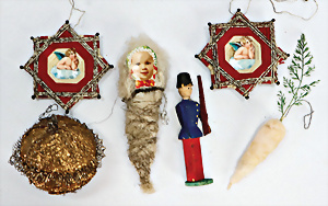 6 Teile, Weihnachtsschmuck, Watte, Wickelkind, Oblaten-Gesicht, leonische Drähte, Kugel, Karotte, 2 Sterne, 1 ERZGEBIRGE Figur, 7,5 cm