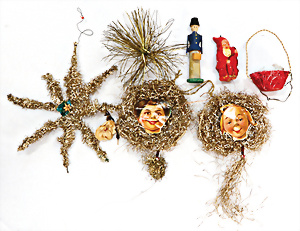 Konv. Weihnachtsschmuck, Sterne, leonische Drähte, 1 Oblaten-Gesicht, Max, kl. Korb, ERZGEBIRGE Figur, Weihnachtsmann, Masse