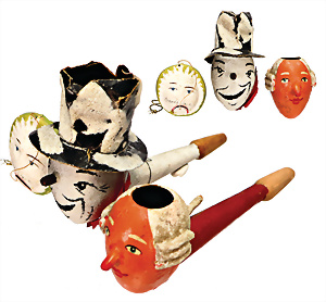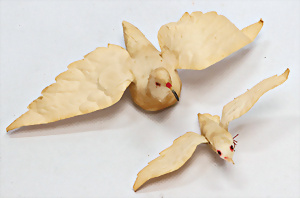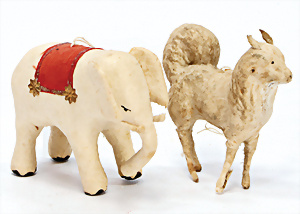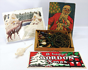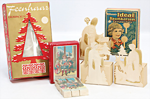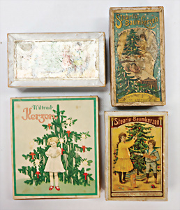 3 Teile, Christbaumschmuck, Schachteln, Baumkerzen, Rübsam´s ideal, 30er Jahre mit Inhalt, 1 Legespielt, neuer, 1 Schachtel Feenkraut, Nachkrieg, 3 Papp-Aufstellfiguren, 12 cm