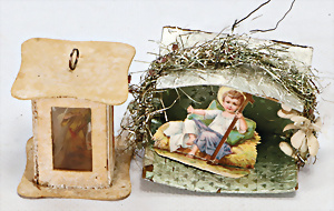 2 Teile Christbaumschmuck, Laterne mit Oblaten-Bild, Pappe-Glimmer, 5 cm, Krippe mit Jesus-Kind, Pappe