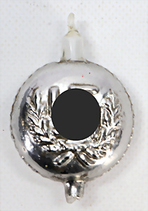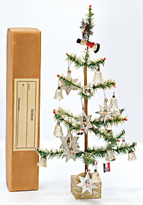 Federbaum mit Glasschmuck auf Pappsockel (Candy-Container), 49 cm, Feldpostschachtel, mit Glasschmuck u. Sternen, lithogr. Militär-Portraits