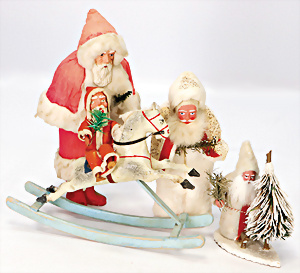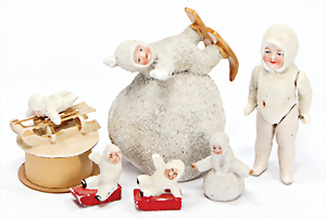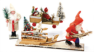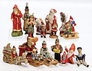 Konv. Porzellan-, Masse- u. Holz-Figuren, Weihnachtsmänner, Kinder auf Schlitten, 15 Teile, 4-7,5 cm