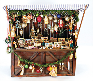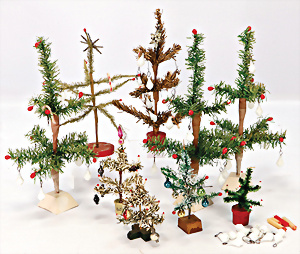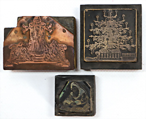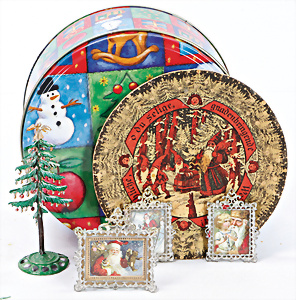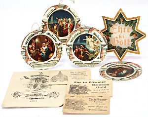 Konv. Zubehör, Weihnachtsszenen für Puppenstube, Weihnachtsteller, D: 12 cm, Zinn-Weihnachtsbaum, 1 Zweig fehlt, Puppenstuben-Bilder