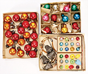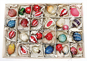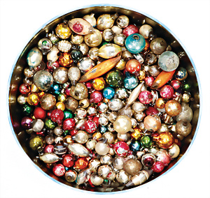 1 Blechdose voll Kugeln für Weihnachtskette, untersch. Formen, reichh., teils gut teils etwas bestoßen